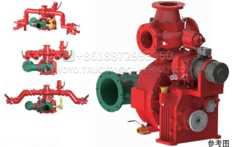 Suction pipe: The pump is equipped with a DN100 inlet, which can draw water from natural water sources, liquid tanks, and fire water storage tanks. Additionally, a conversion reducer interface can be added to connect to the fire hydrant for suction and supply. The suction pipe is placed on the roof of the vehicle. 1 inlet with a DN100 butterfly valve (optional pneumatic butterfly valve) for connection to the water tank.