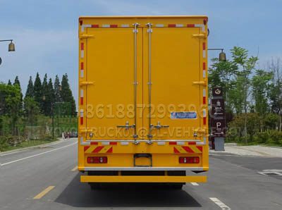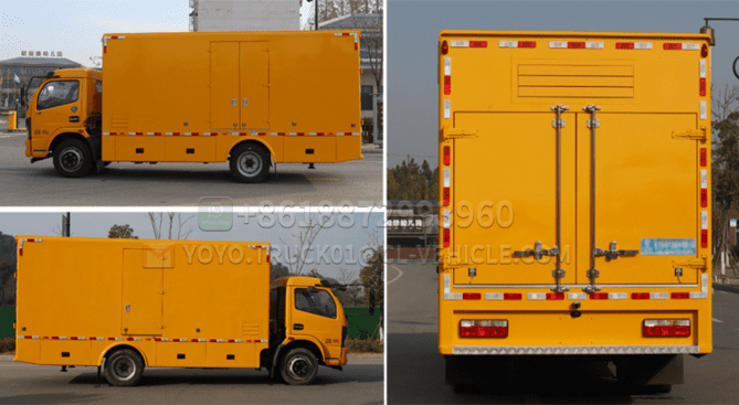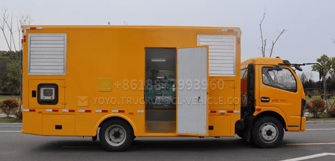 The noise level of a typical diesel generator set in operation is around 110 dB. The intake and exhaust Windows of the mobile emergency power supply vehicle are designed with patented technology. The intake and exhaust Windows are opened by gas springs without affecting the unit’s power output and temperature rise requirements, and a set of sound-absorbing baffles are used inside the Windows for noise reduction. The structure is simple, which can both maximize the effective intake and exhaust volume of the unit and meet the requirements for noise reduction. The exhaust system of the power supply vehicle uses A combination of a resistive muffler and an anti-noise device, which can reduce exhaust noise by 35 to 40 dB (A). The side panels of the vehicle are filled with sound-absorbing cotton of a thickness of 50 to 100 mm according to the noise requirements, and rubber sealing strips are installed in all doors and Windows to achieve good sound insulation and noise reduction effects. The power vehicle, after noise reduction treatment, has an average noise level of around 80 dB(A) at a distance of 1 m from the vehicle when fully loaded. The performance is significantly better than that of other similar domestic products.
