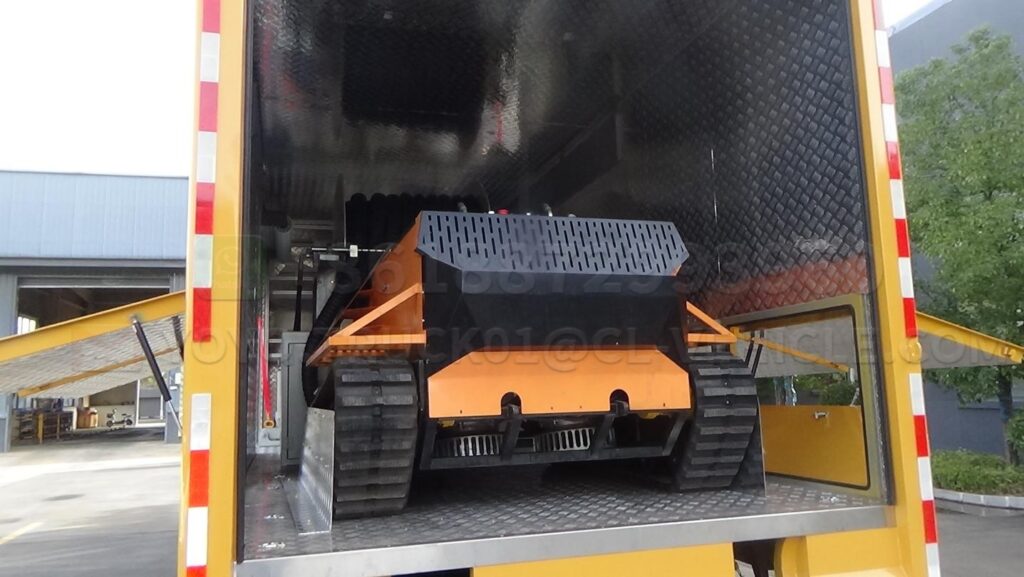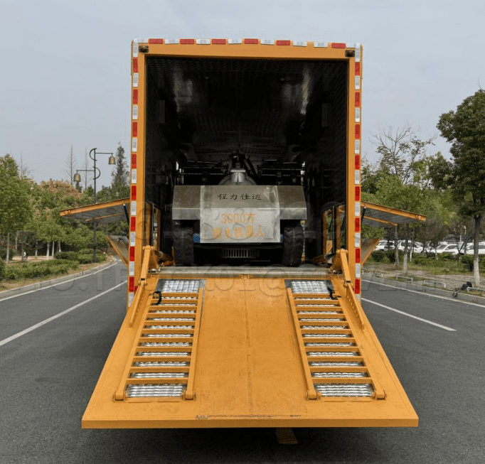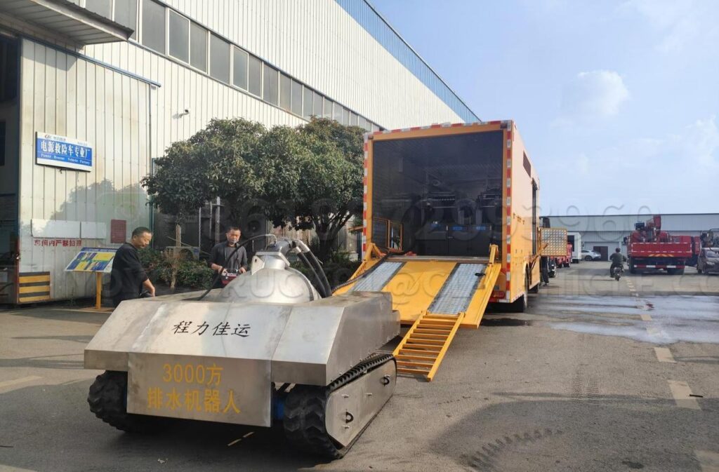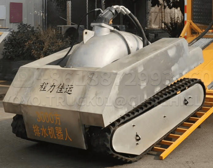 | 4 | Drain robot | The drainage robot is mainly composed of a rubber track chassis, a water pump, etc. The total drainage capacity of the robot is 3000 cubic meters per hour, with a lift of 16 meters. The walking robot chassis is composed of Chris + Matilda four-wheel balanced suspension, with a unique track tension adjustment, drive system tension adjustment, and integrated drive wheels for smoother operation.