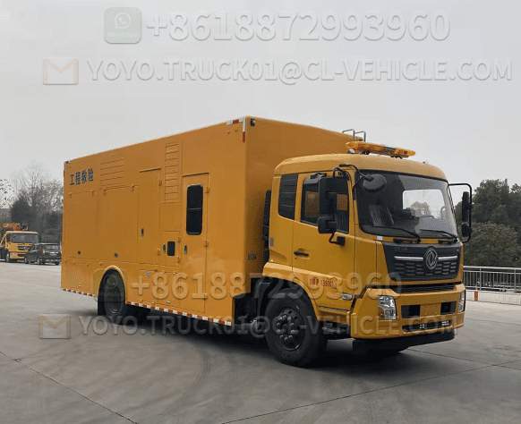 2 Vehicle chassis Dongfeng chassis, half-cab with deflector, Dongfeng Cummins engine 191kw, National VI emission standard; Wheelbase 5100mm; 1000R20 wire tires, original factory air conditioning, original factory hydraulic power steering, original factory ABS, original factory on-board tools. Maximum wading depth of 600mm