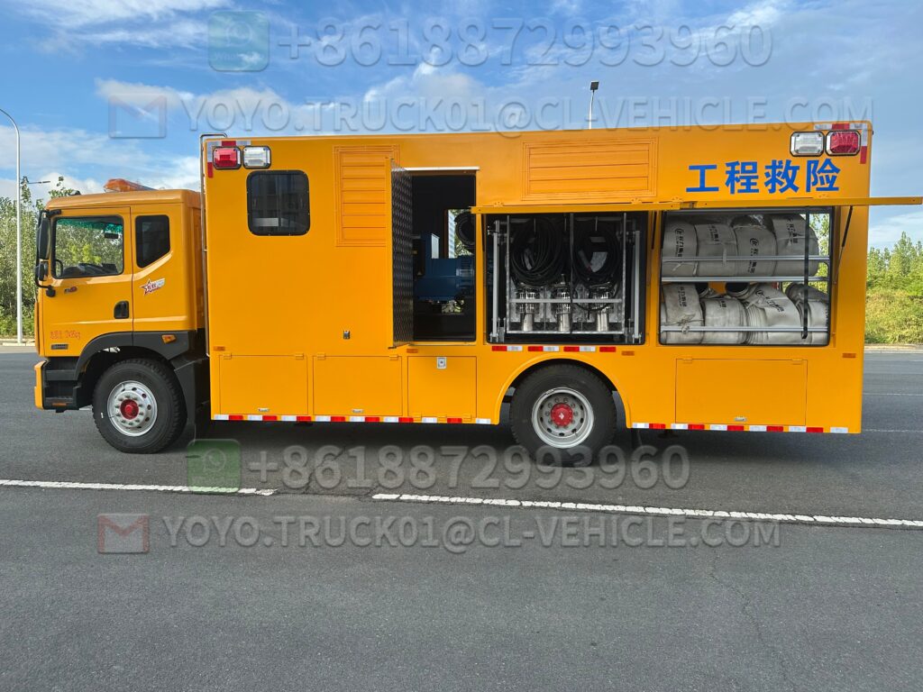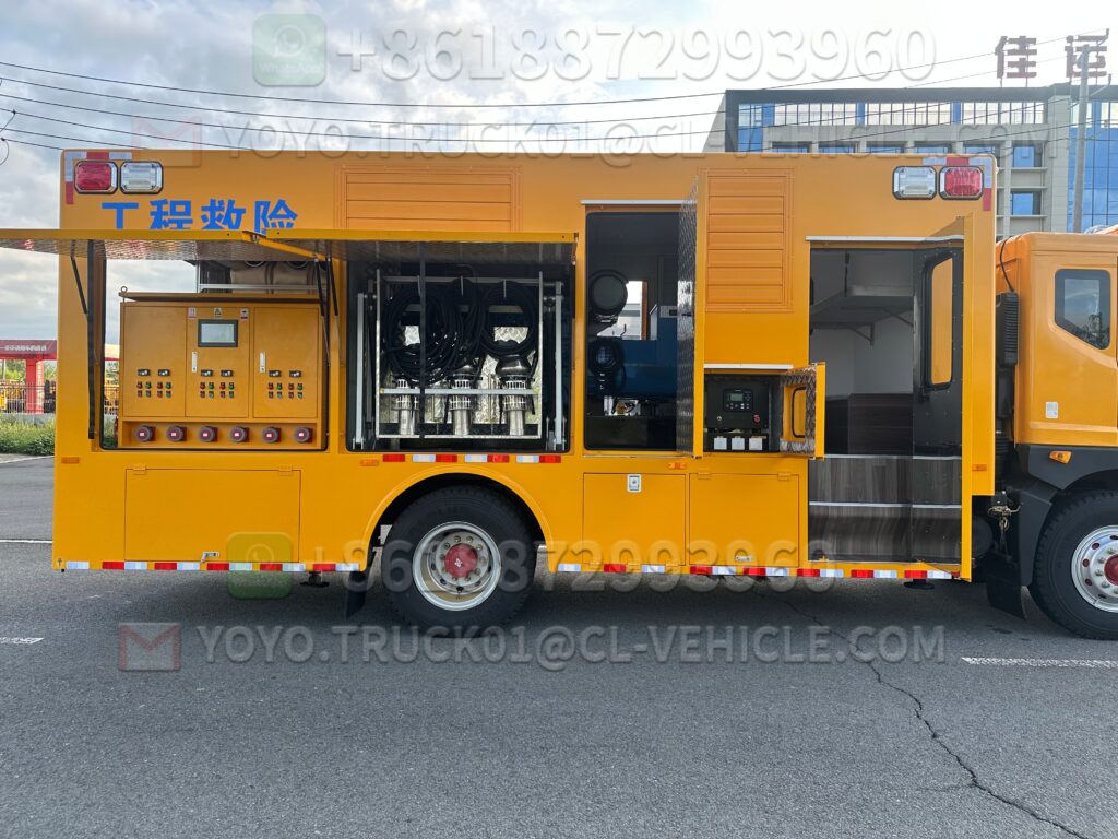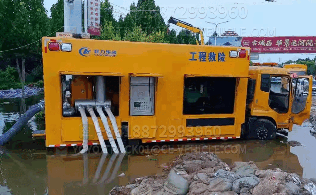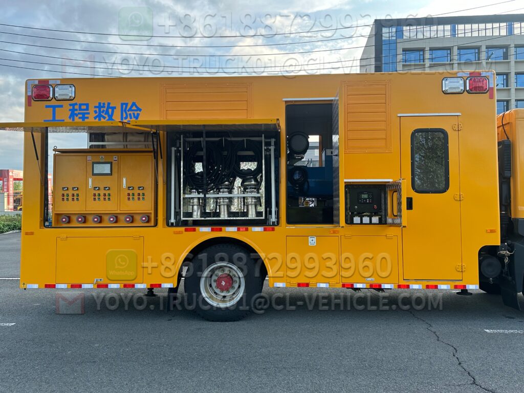 1 Drainage rescue vehicle The vehicle is highly mobile and truly embodies the concept of a mobile water pump. The equipment can meet the needs of emergency drainage rescue and has a mobile power supply function. The vehicle has the “Announcement of Vehicle Manufacturers and Products” issued by the Ministry of Industry and Information Technology of the People’s Republic of China. The whole vehicle has obtained the 3C certification and the purchase tax exemption announcement, and can be legally registered in the place of purchase.