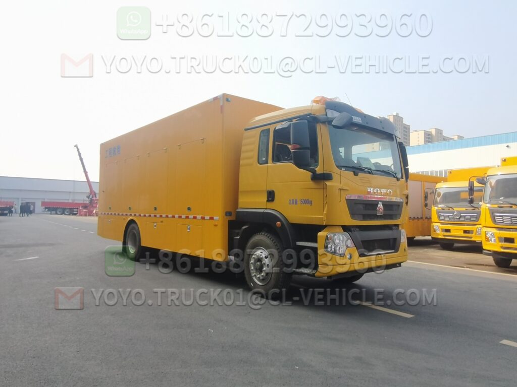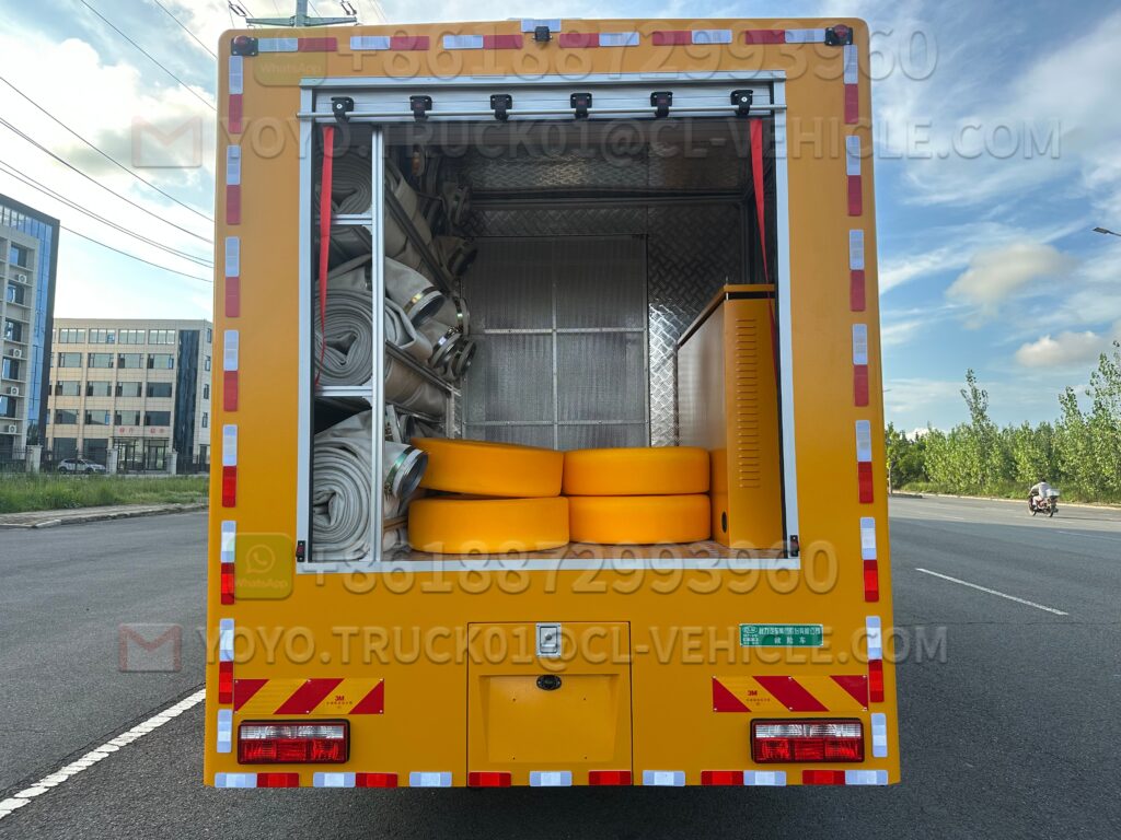 3 Box body The exterior steel of the body is made of high-quality cold-rolled steel plates, and it is lined with high-quality cold-rolled steel plate bent frames. The process is advanced and the strength is firm. The body is fully sealed and meets the requirements of transportation, rain protection, anti-corrosion, fire protection and rust prevention. Aluminium alloy roller shutters are installed at the rear of the carriages. Generator set intake and exhaust air silencing treatment, silencers for noise reduction treatment. Doors are set on both sides of the water pump in the carriage, rainproof louvers are installed at the generator air intake and exhaust outlets, and hidden pull-out ladders are set under the working doors and at the rear, which are connected to the frame of the carriage floor.