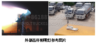 11 External lighting Lift lighting fixtures are installed on the rear top of the carriage, with a power of 150×2=300W; The pole is raised 1800mm and the horizontal rotation Angle      is 360°; The vertical rotation Angle is 330°, and it can be operated by both line control and remote control, making it convenient for night environment operations.