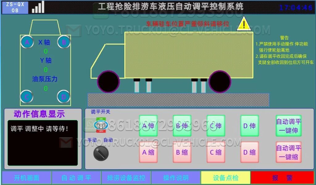 15 Hydraulic support and control The vehicle is equipped with four hydraulic support legs to evenly distribute the vehicle’s static pressure in the stationary state, protecting the wheels and spring plates. The imported high-quality multi-way valve assembly is selected, the hydraulic support cylinder is equipped with imported seals, the static load of a single leg is 5 tons, and a bidirectional hydraulic lock is added.
