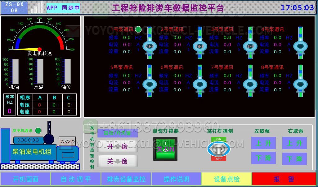 5 Generator set It is equipped with a brushless generator set with a power of 300KW, which can meet the full-load continuous safe operation of the pump for a long time, with a rated frequency of 50HZ and a rated voltage of 220/400V. Speed control methods: Electronic speed control, start battery, battery main switch. The base oil tank capacity of the generator set is sufficient to ensure that the generator set operates at full load for 8 hours, and the installation position is reasonable and convenient for maintenance personnel to refuel on a daily basis. The control system can display water temperature, oil pressure, rotational speed, frequency, and all voltages, currents, powers, etc. can be intelligently achieved with one click
