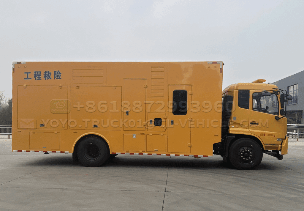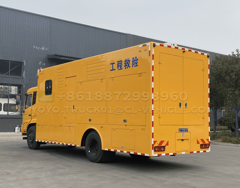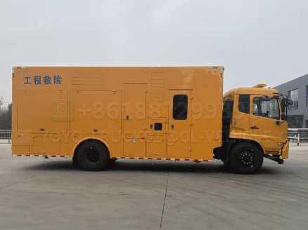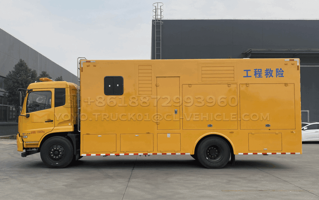 | 13 | Box body | The exterior steel of the body is made of high-quality cold-rolled steel plates, and it is lined with high-quality cold-rolled steel plate bent frames. The process is advanced and the strength is firm. The body is fully sealed and meets the requirements of transportation, rain protection, anti-corrosion, fire protection and rust prevention. Aluminium alloy roller shutters are installed at the rear of the carriages. Generator set intake and exhaust air silencing treatment, silencers for noise reduction treatment. Doors are set on both sides of the water pump in the carriage, rainproof louvers are installed at the generator air intake and exhaust outlets, and hidden pull-out ladders are set under the working doors and at the rear, which are connected to the frame of the carriage floor. | ![]() |