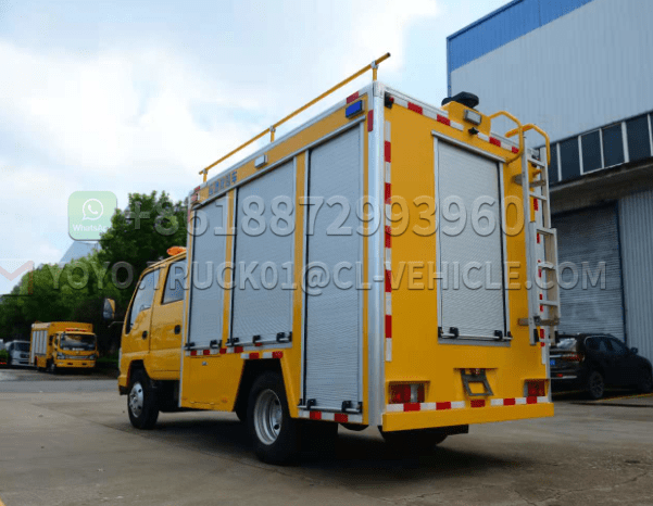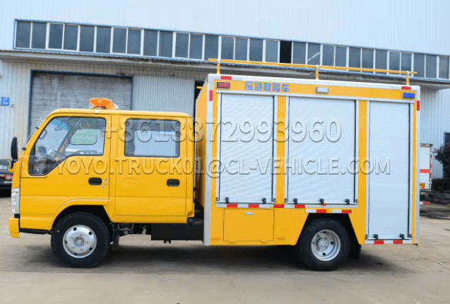| 7 | Box design | The box is designed according to the customer’s requirements for the placement of equipment inside the vehicle. Fire truck ladders are placed at the rear of the compartment and guardrails are placed on the top of the compartment to facilitate the placement of lightweight rescue equipment such as ladders, pipes and other lightweight rescue supplies. The interior of the vehicle is equipped with a stainless steel tool cabinet, which can accommodate small rescue equipment and rescue tools