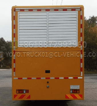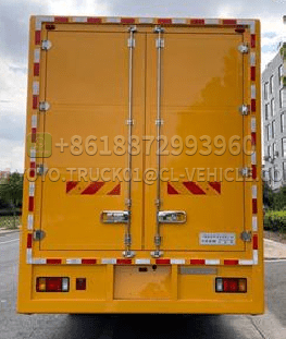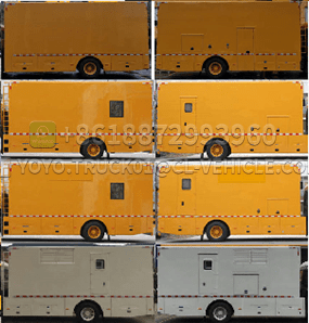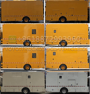 The outer steel of the box body is high-quality cold-rolled steel plate, lined with high-quality cold-rolled steel plate bent frame, advanced technology, firm strength. The body is fully sealed and meets the requirements of transportation, rain protection, anti-corrosion, fire protection and rust prevention. The rear of the carriage has double doors. The intake and exhaust air of the generator set is silenced, and the muffler is silenced.