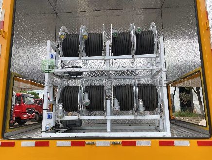 Electric hydraulic winch, located at the rear of the carriage. Use the ‘electric cable winch’ with patented technology. The cable winch can be freely retracted and extended according to different specifications of cables, and is very easy to operate, achieving the best working effect. Cable length is 50 meters (optional configuration, cable length can be customized according to customer requirements)