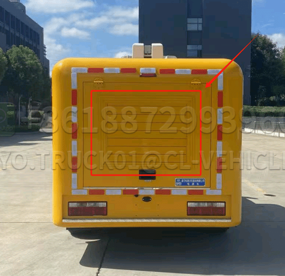 2. The compartment is fully enclosed, and all locks, handles and electrical connectors in the compartment are vehicle-specific. All doors are made using car manufacturing techniques. 3. Waterproof material signs such as safety warnings and safety operating procedures are affixed to the interior of the cabin; 4. The interior of the compartment where the generator set is installed is treated for noise reduction, and the noise reduction and sound absorption materials are composite materials that are harmless to human body for long-term use; After the noise reduction treatment of the body, when the generator set operates normally under load, the overall average noise value of the vehicle (1 meter from the center, 1.6 meters in height) is ≤85dB (A). 5. A 20mm thick rubber shock-absorbing pad is used for primary shock absorption between the body and the chassis, and special shock absorbers are used for secondary shock absorption between the generator and the body |