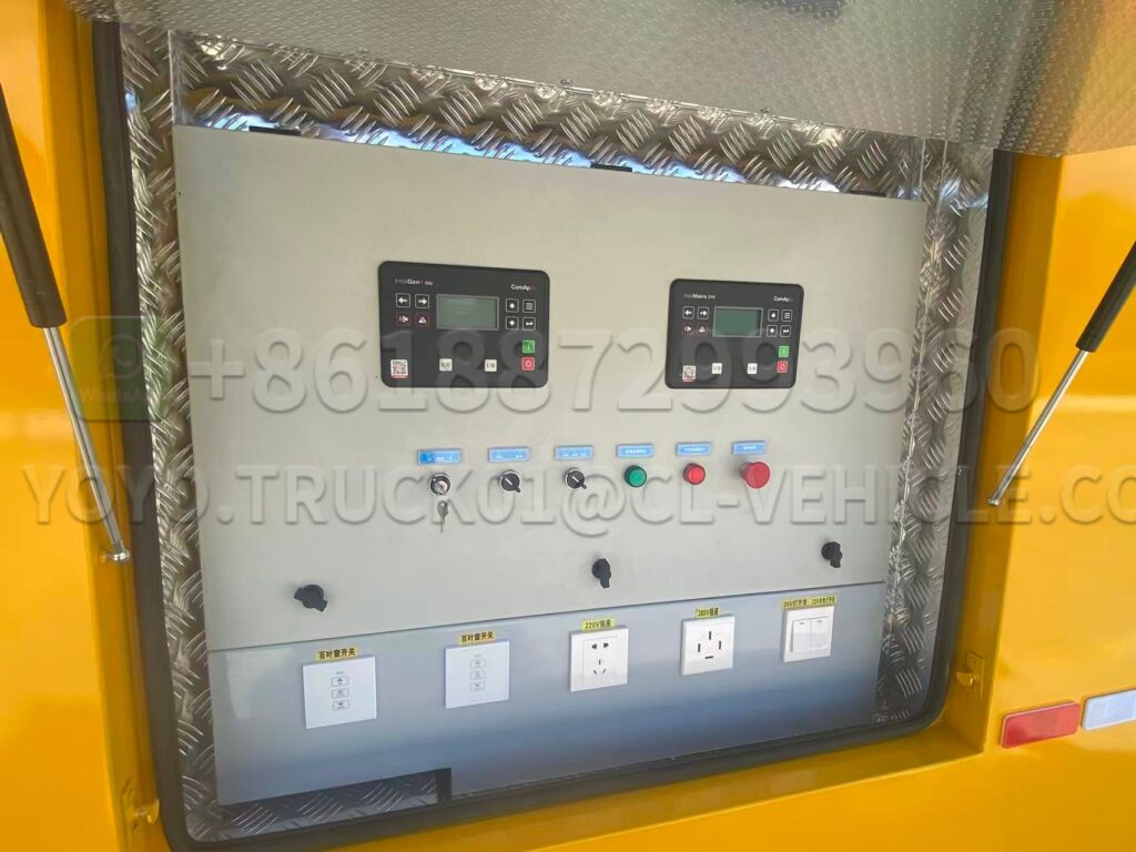 The vehicle’s circuits are centrally controlled and equipped with AC/DC power distribution systems for use with chargers, lighting, sockets, etc. One set of 380V and one set of 220V external power output sockets; |